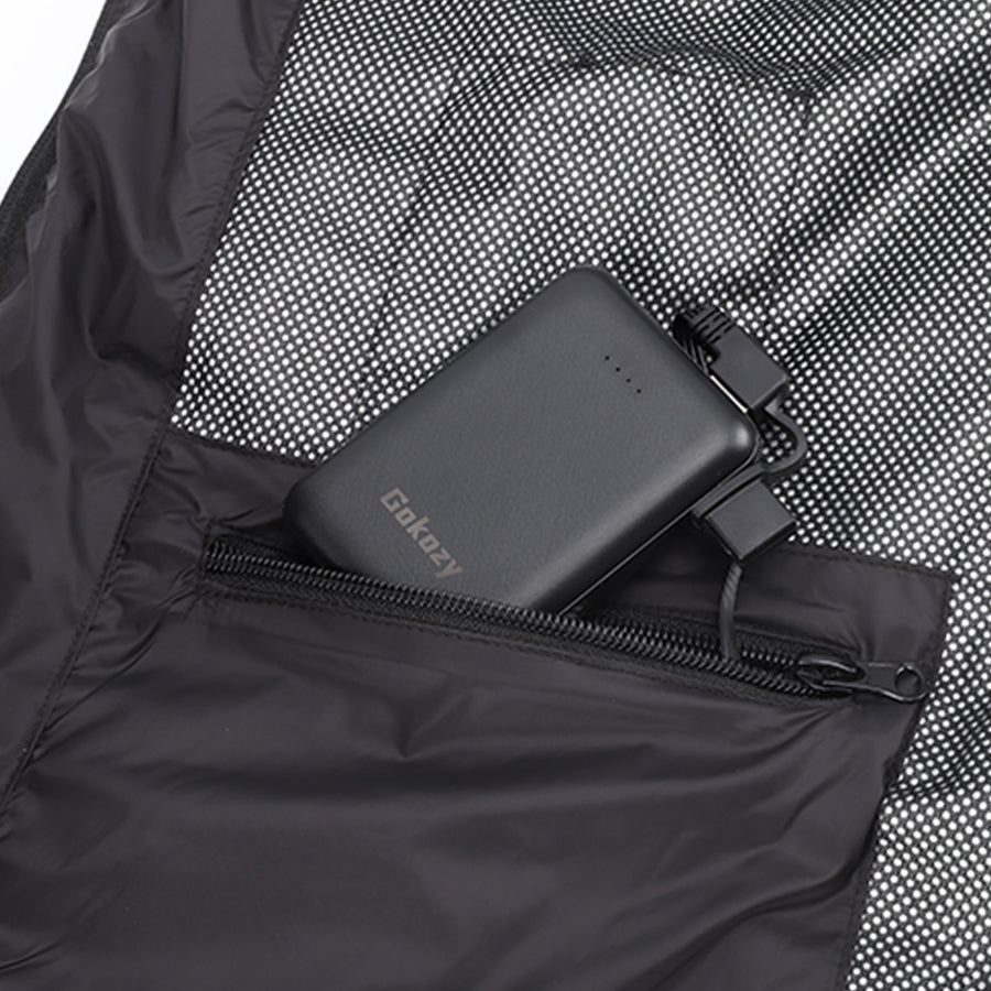 - 5 carbon fiber heating elements (left & right pockets, collar, upper back, and lumbar area) provide full-body warmth, including extra support for your lower back.